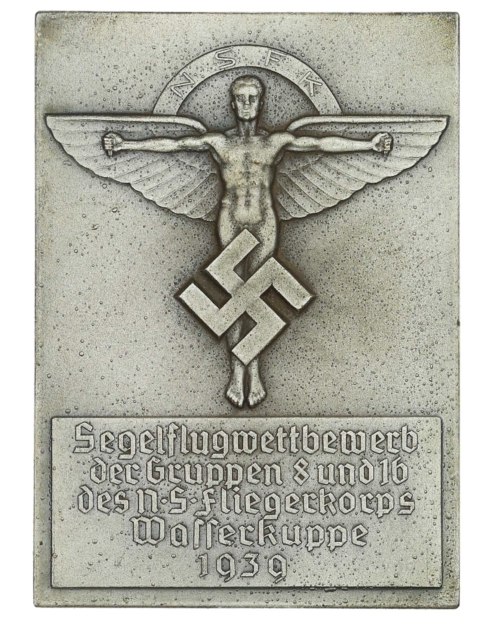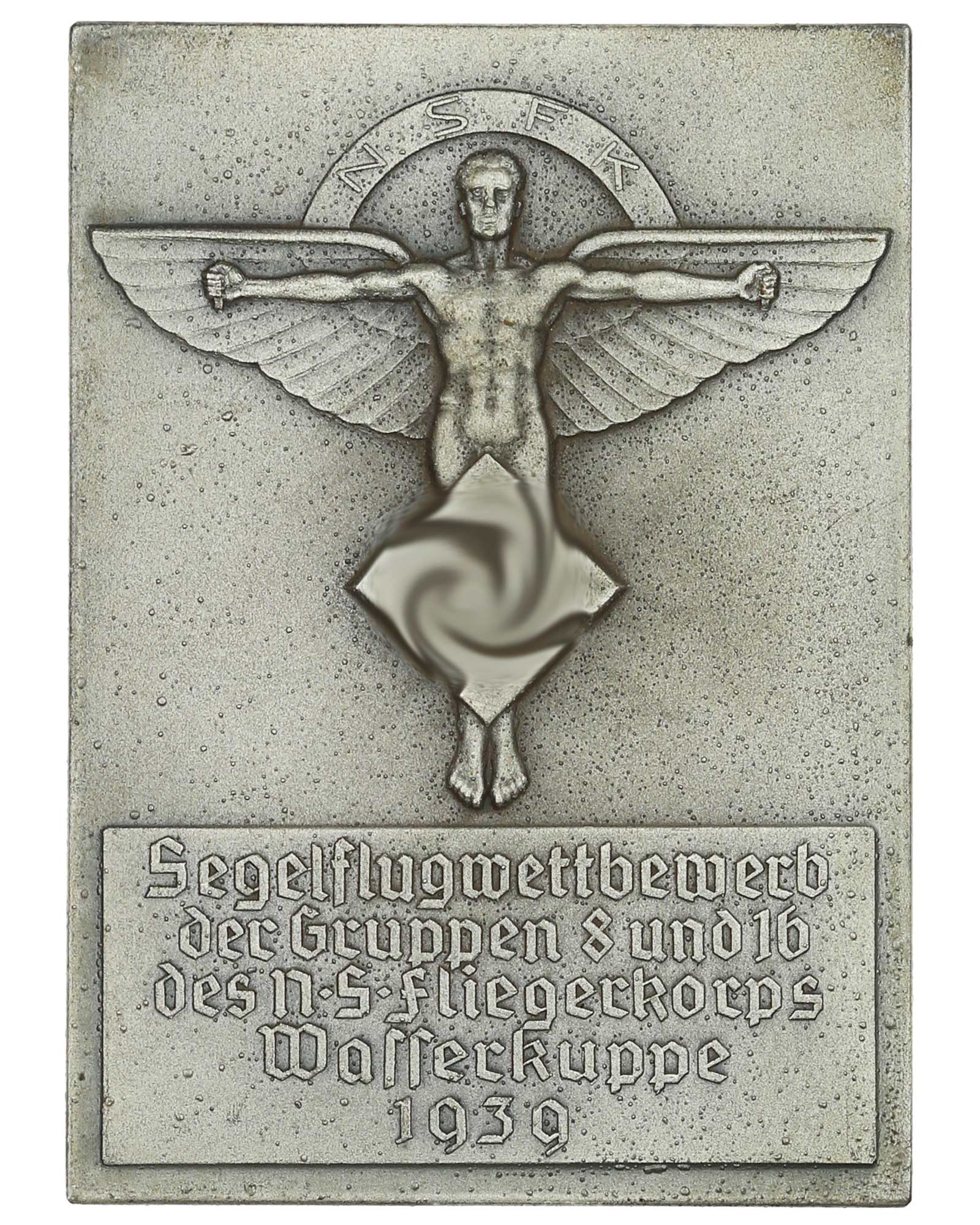 Наградная плакетка NSFK «Segelflugwettbewerb der NSFK-Gruppen». Национал-социалистический авиационный корпус [НСФК] односторонняя плакетка. Плакетка изготовлена из алюминия. Значок имеет прямоугольную форму с надписью: соревнования по скольжению групп NSFK 8 и 16 из NS Fliegerkorps Wasserkuppe 1939 (Segelflugwettbewerb der NSFK-Gruppen 8 und 16 des NS Fliegerkorps Wasserkuppe 1939).