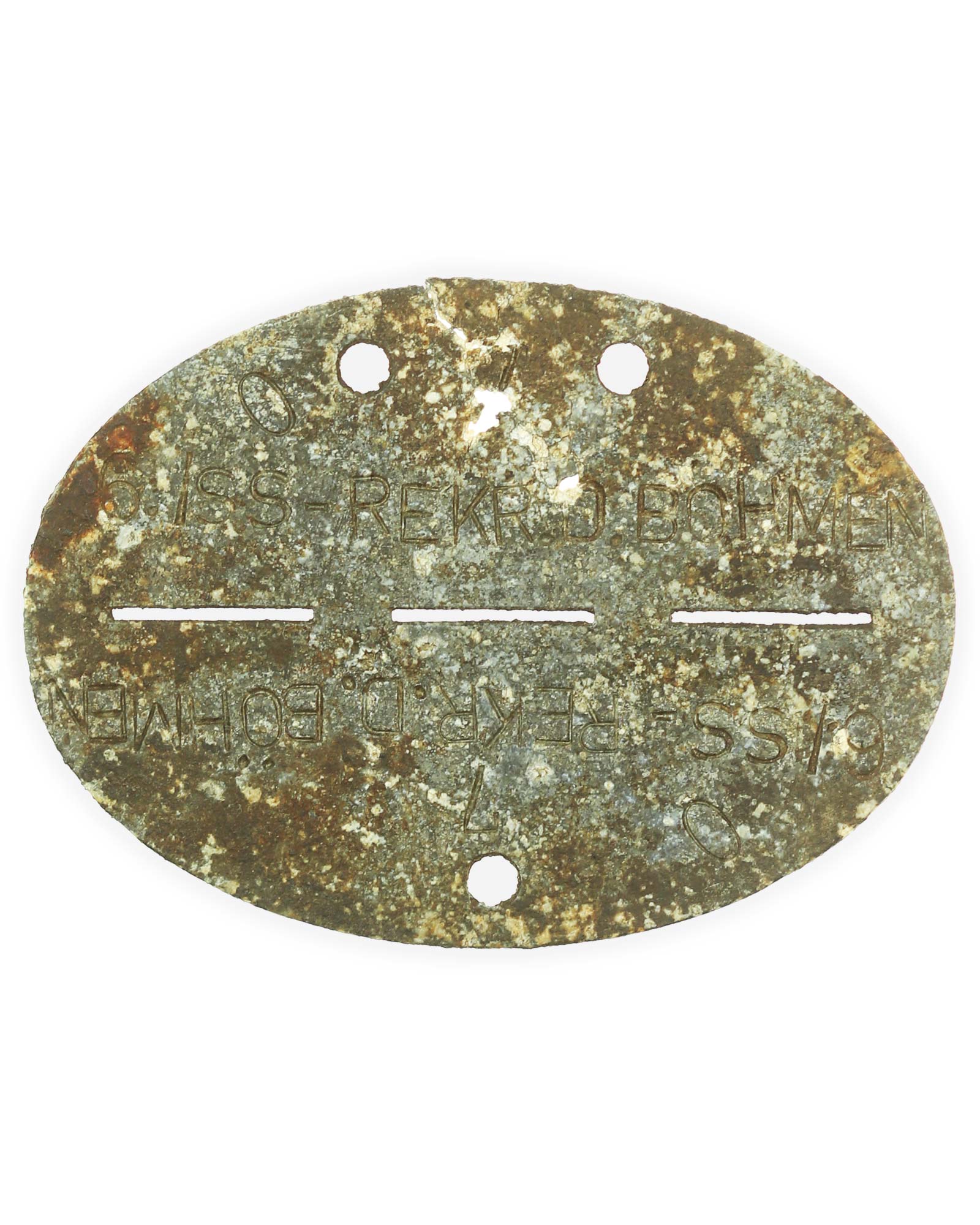 Опознавательный жетон Ваффен-СС "6./SS-Rekr.D.Böhmen". Чистый цинк, с надписью, состояние б/у. Это жетон с номером 7.