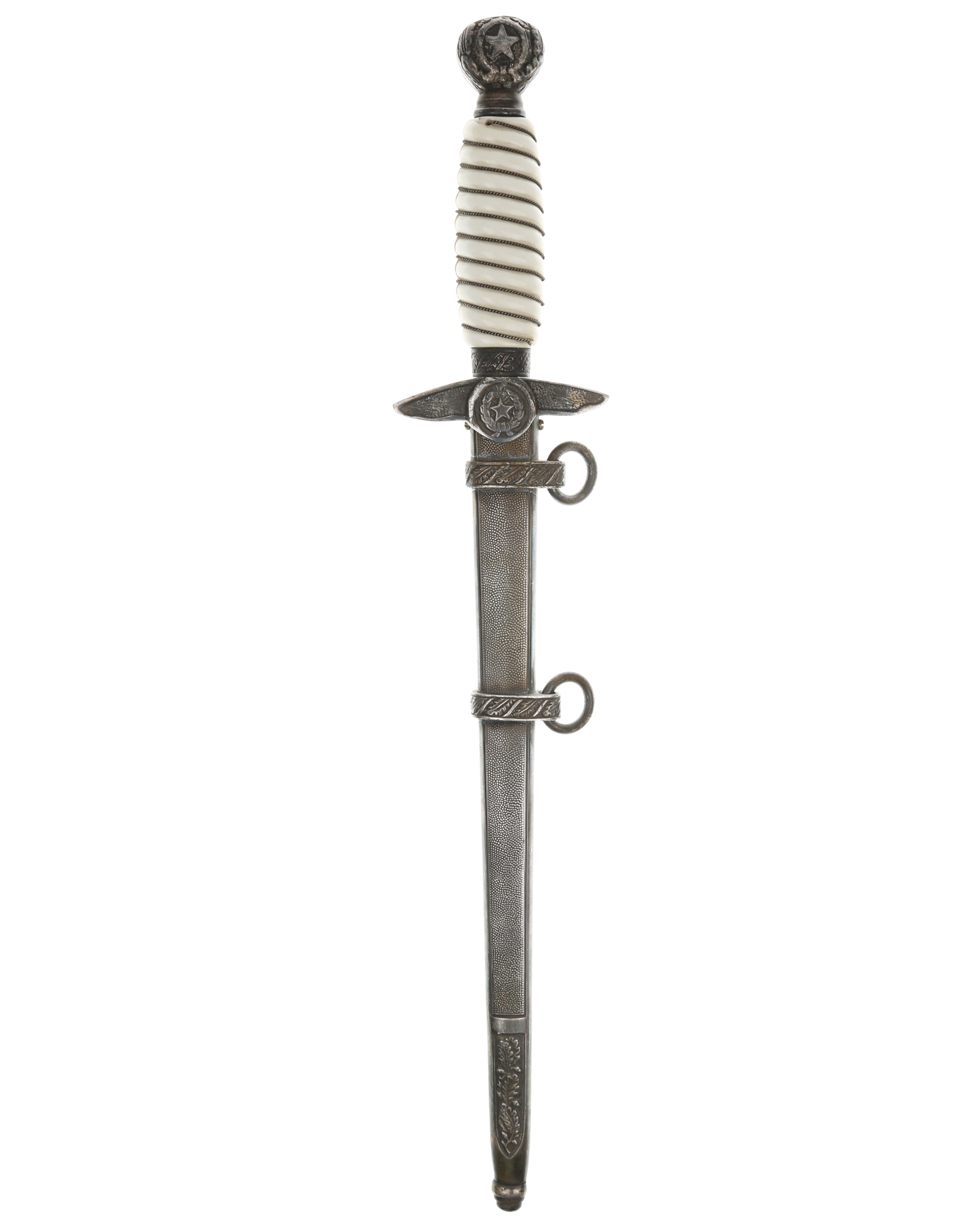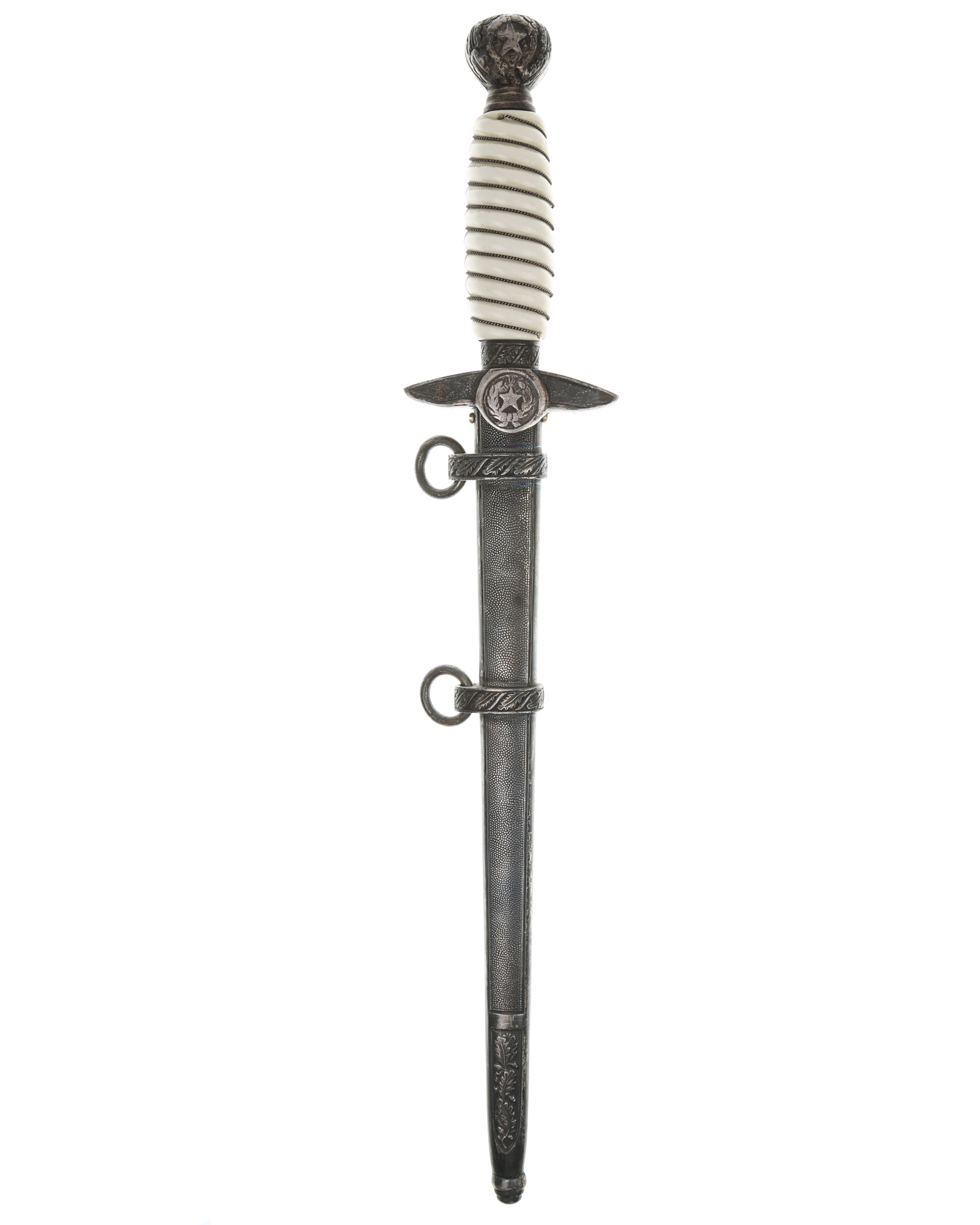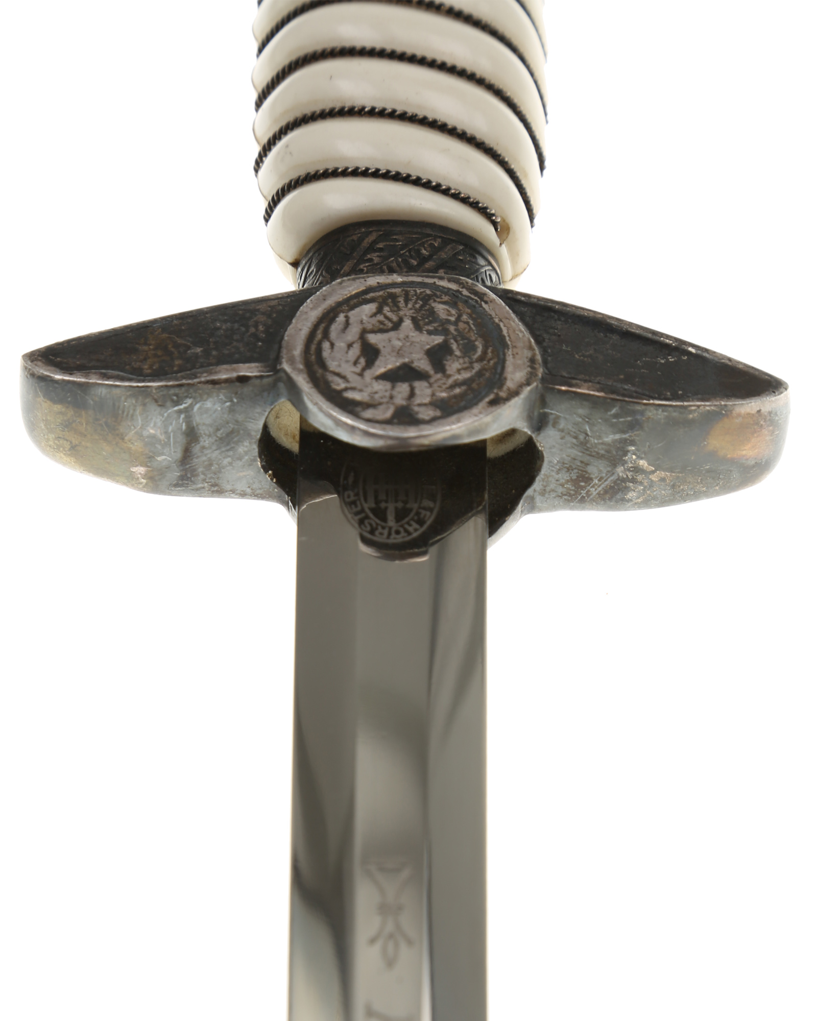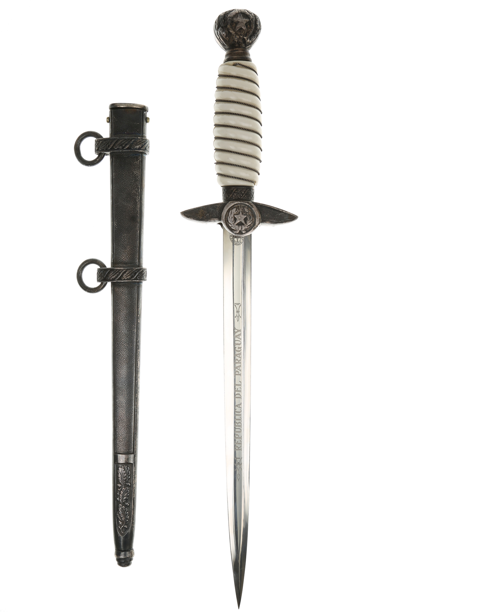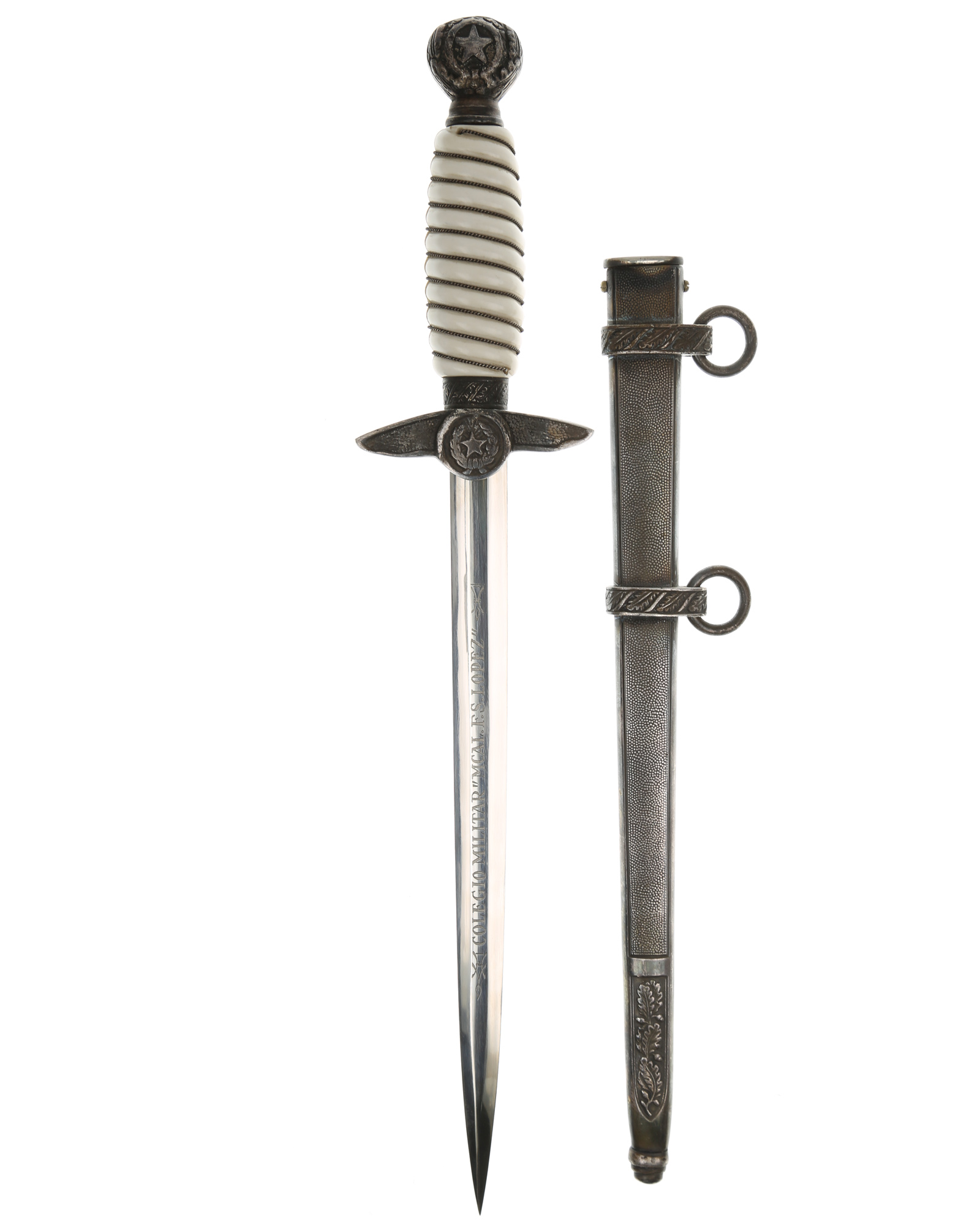 Кортик кадетвоенно-воздушных сил Парагвая. Ручка круглая, пластмассовая, белого цвета. По спиральным желобкам рукоять обмотана крученой прово локой. Внизу имеется цилиндрическая втулка, украшенная орнаментом из дубовых листьев. Головка рукояти шарообразная, отлита вместе с верхней втулкой. Головка рукояти украшена с двух сторон рельефным изображением пятиконечной звезды и орнаментом из дубовых листьев, навинчивается на хвостовик клинка, которая также находится на гербе Парагвай. Крестовина литая, со слегка опущенными книзу закругленными сверху и фигурными снизу краями. С лицевой и обратной стороны крестовина имеет точечный фон. С верхней стороны поверхность крестовины украшена рельефным орнаментом из дубовых листьев. Под перекрестьем располагаетсяклеймо производителя. На лицевой стороне клинка имеется надпись «COLEGIO MILITAR MCAL F. S. LOPEZ», на обратнойстороне — «REPUBLICA DEL PARAGUAY».Производитель кинжала: E. & F. Horster Solingen. Влагалище абсолютно идентична немецкими Люфтваффе кинжал модели 1937. Кинжал был изготовлен, вероятно, незадолго до начала Второй мировой войны в Золингене.