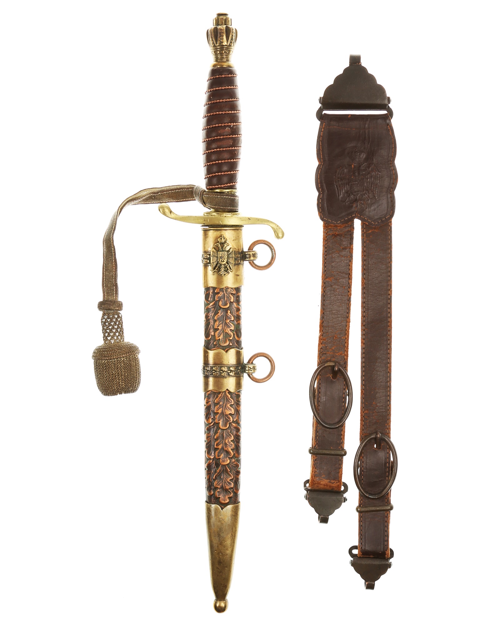 Кортик носили офицеры югославской армии в период 1939-1941. Клинок стальной никелированный, прямой, двулезвийный. На пяте с лицевой стороны изображён югославский двуглавый орёл, на противоположной – крестообразное клеймо ОФИЦИРСКА ЗАДРУГА с миниатюрным двуглавым орлом под короной. Эфес состоит из рукояти, головки и крестовины со втулкой. Рукоять веретенообразной формы, деревянная крашеная, обмотана по спиральным желобкам двойной перевитой проволокой белого металла. Головка рукояти латунная, в форме стилизованной короны, скрепляется с хвостовиком клинка. Латунная крестовина уплощена, имеет каплевидные концы, загнутые в противоположные стороны – к клинку и к рукояти. Одно целое с ней составляет втулка с узким пояском. Ножны медные, со штампованным орнаментом в виде дубовых листьев. Латунный прибор закреплён на железных накладках и включает в себя широкое устье и обоймицу с кольцами, а также наконечник. Все детали прибора имеют фигурные вырезы по краю, устье и обоймица украшены рельефным пояском из дубовых листьев. На устье с лицевой стороны также прикреплён хромированный югославский орёл. Наконечник гладкий, с каплевидным завершением. Сохранился кожаный портупейный ремень с тиснёным изображением двуглавого орла и латунным прибором. Ношение форменных кортиков в югославской королевской армии было упорядочено регламентом, введённым в действие с 1939 г. при короле Петре II. Маркировка ОФИЦИРСКА ЗАДРУГА («офицерское сообщество», от задруга – община или большая патриархальная семья) указывает на мелкооптовое производство и сбыт подобных предметов вооружения армейским офицерам внутри замкнутых корпоративных объединений.