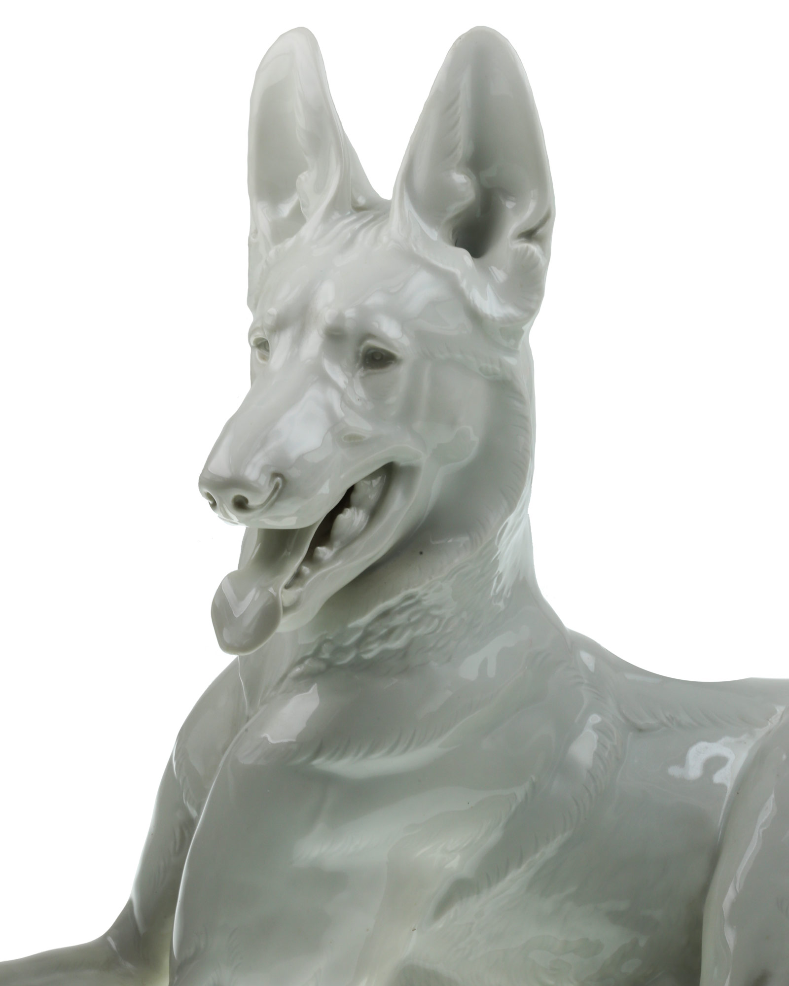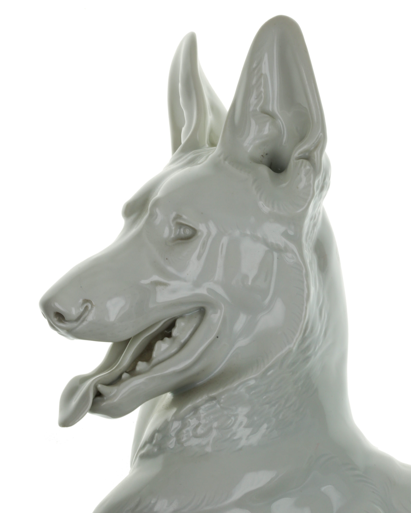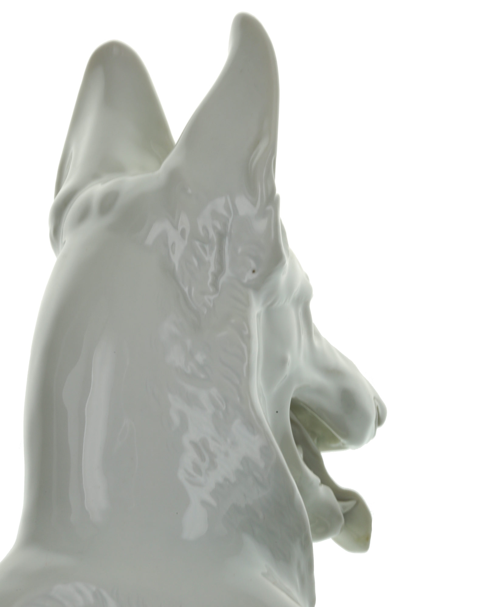 Большая овчарка (Schäferhund), модель № 76. Теодор Кернер, выполненная из высококачественного белого глазурированного фарфора. Произведена на известной фабрике Аллах (Allach). Художник: Т. Кернер (Prof. Theodor Kärner). Размер: высота 255 мм. На нижней плоскости статуэтки имеется клеймо фирмы, номер модели - № 76.