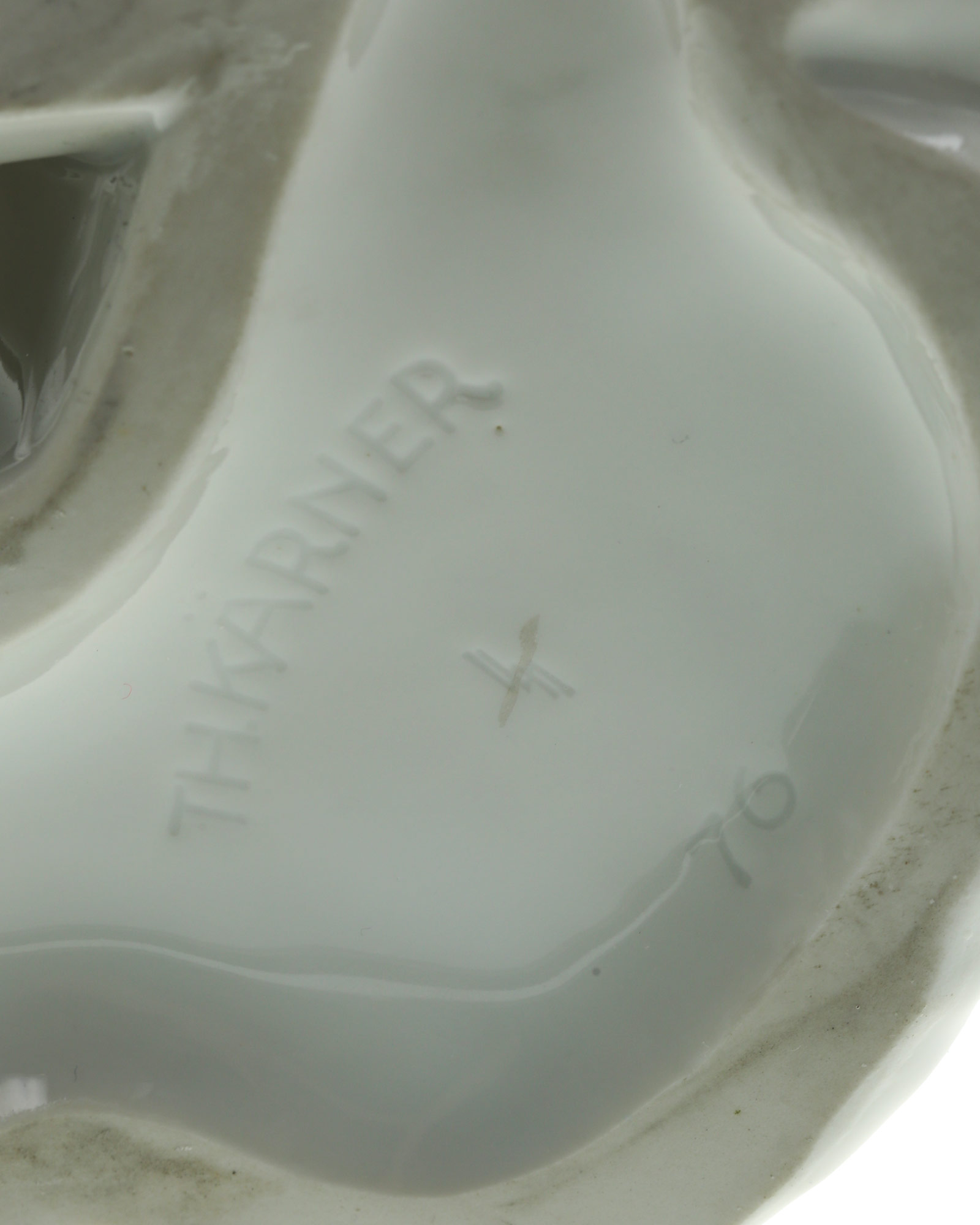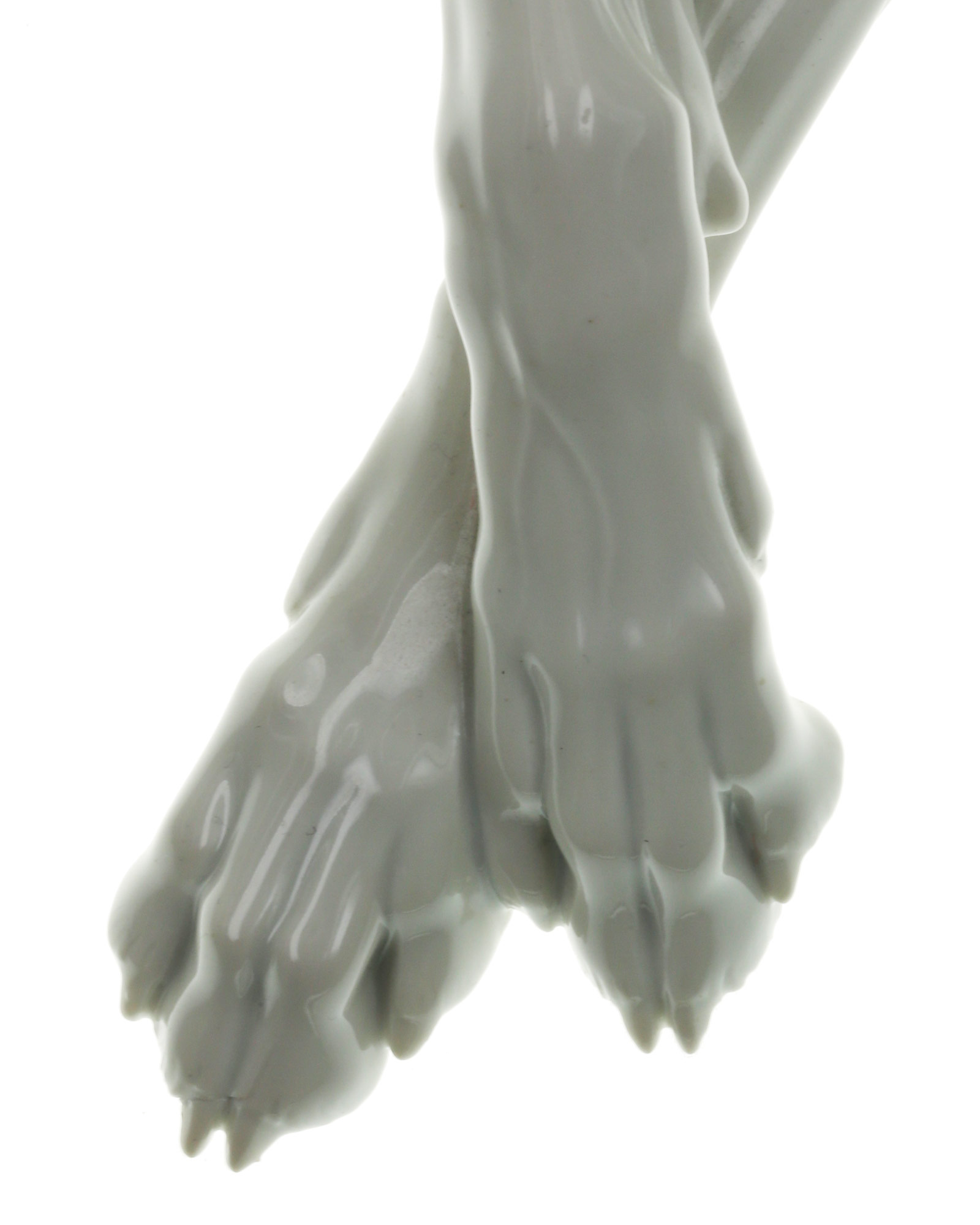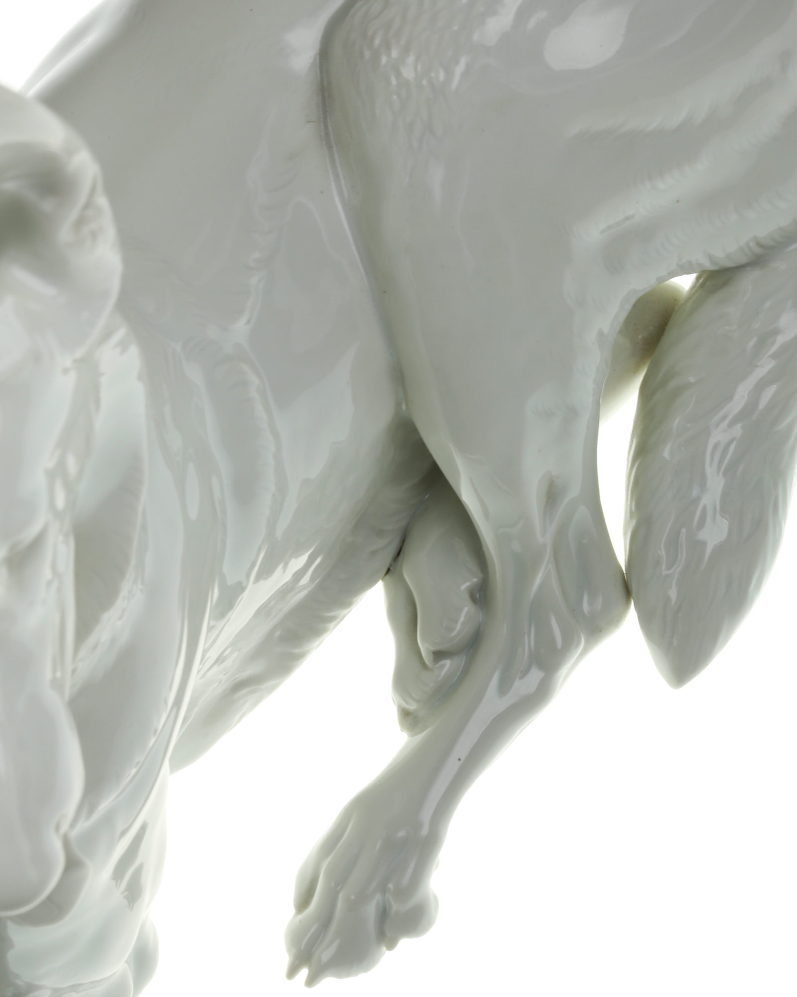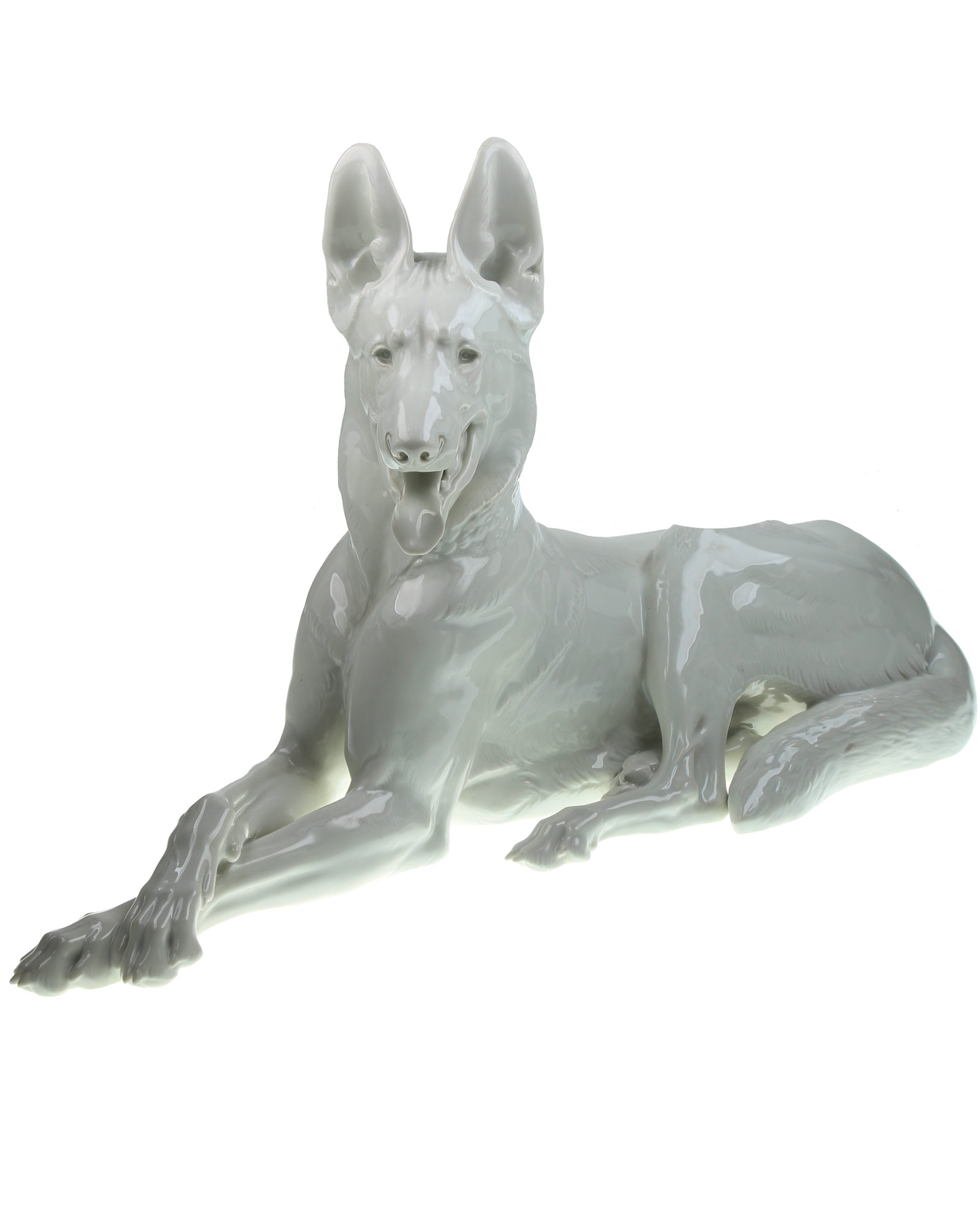 Большая овчарка (Schäferhund), модель № 76. Теодор Кернер, выполненная из высококачественного белого глазурированного фарфора. Произведена на известной фабрике Аллах (Allach). Художник: Т. Кернер (Prof. Theodor Kärner). Размер: высота 255 мм. На нижней плоскости статуэтки имеется клеймо фирмы, номер модели - № 76.