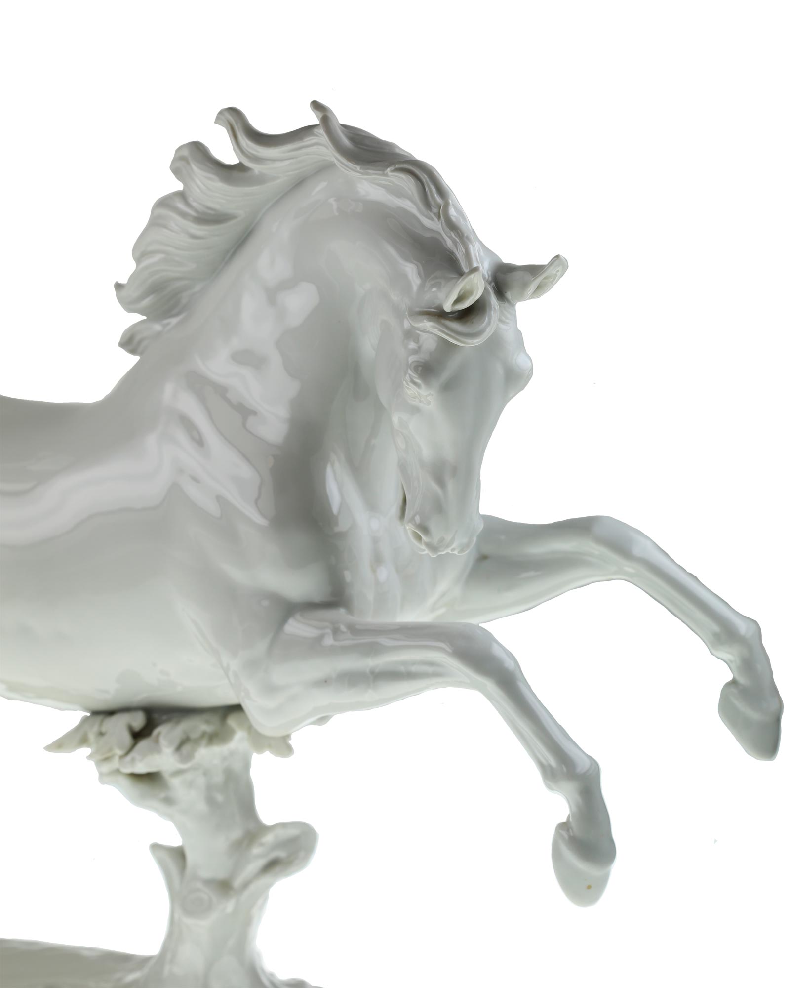 Лошадь, прыгающая (Pferd, springend), модель № 74. Теодор Кернер (Th. Kärner), выполненная из высококачественного белого глазурированного фарфора. Произведена на известной фабрике Аллах (Allach). Художник: Т. Кернер (Prof. Theodor Kärner). Размер: высота 353 мм. На нижней плоскости статуэтки имеется клеймо фирмы, номер модели - № 74,