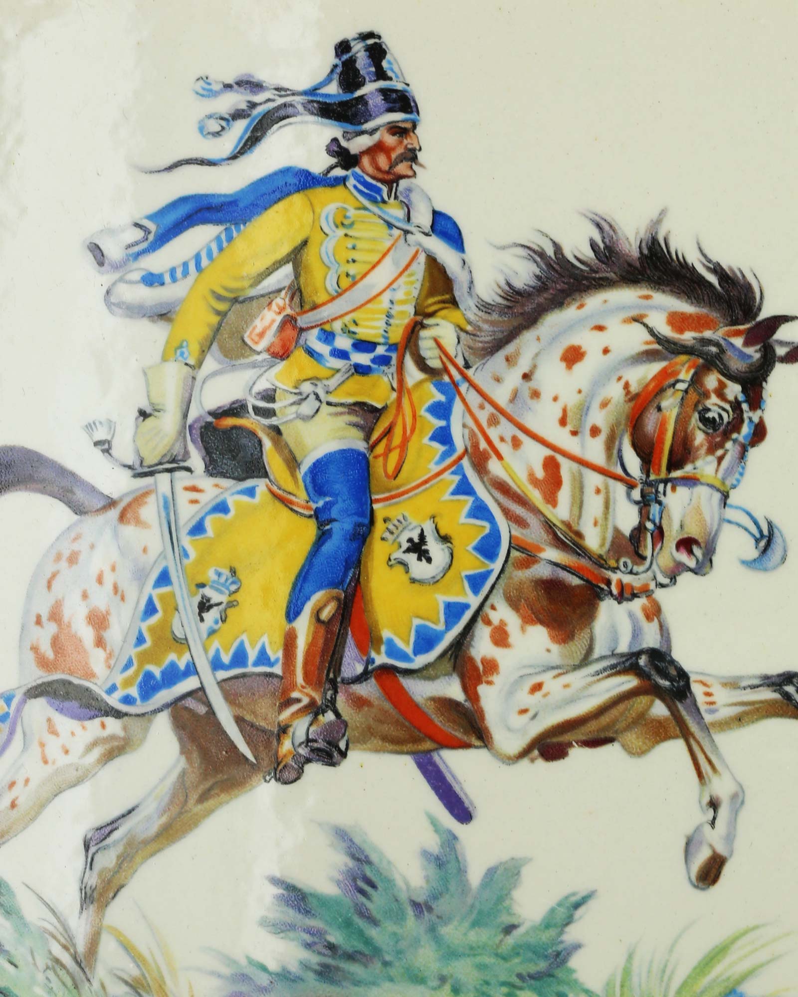 Белый кафель с изображением (Malachowski-Husars), смоделированной на рисунке фарфора Allach, номер модели "121", разработанный профессором Теодор Кернер. Размеры 150 х 150 мм. Очень хорошее состояние.
